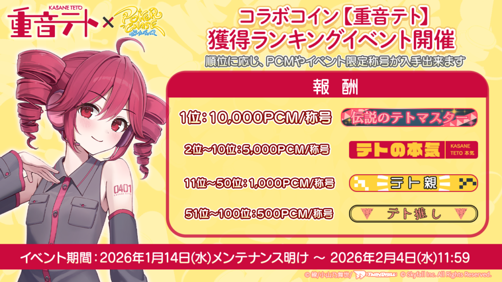 コラボ開催期間中に「コラボコイン【重音テト】」の総獲得枚数を競う、獲得ランキングイベントを開催します。PCMに加えて、順位に応じてイベント限定称号を入手できます。