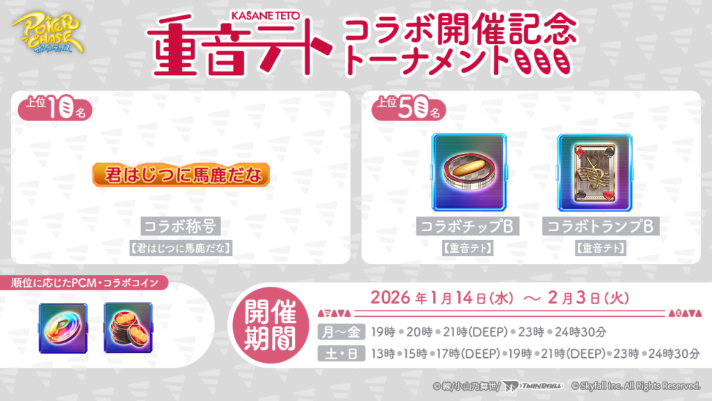 順位に応じたPCMや「コラボコイン【重音テト】」を獲得できるトーナメントを是非お楽しみください!