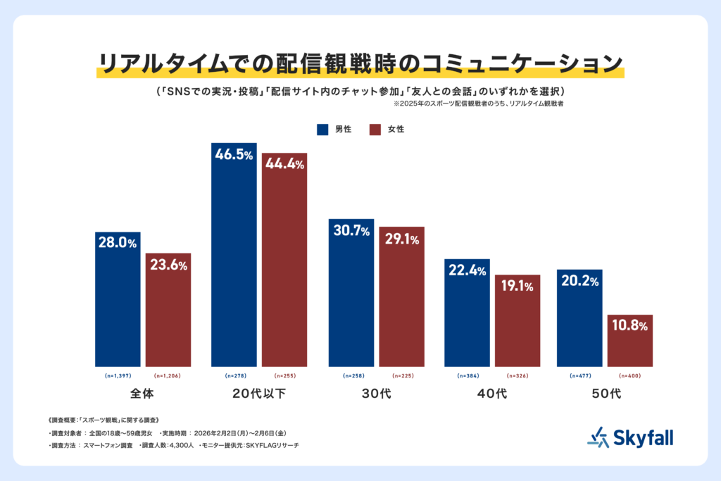 2025年にテレビまたはネット配信で観戦した人のうち、リアルタイムで観戦した2,604人を対象に「リアルタイム配信で観戦する際にしていること」を聞いたところ(複数回答可)、コミュニケーションを取りながら観戦している(「SNSでの実況・投稿」「配信サイト内のチャット参加」「友人との会話」のいずれかを選択した)のは、いずれの性別でも20代以下が多く、男性(n=278)が46.5%、女性(n=255)が44.4%となり、30代以上の年代を見ても50代女性(n=400)が10.8%と最も低く、若年層ほどコミュニケーションを取りながら観戦する傾向が明らかになりました。