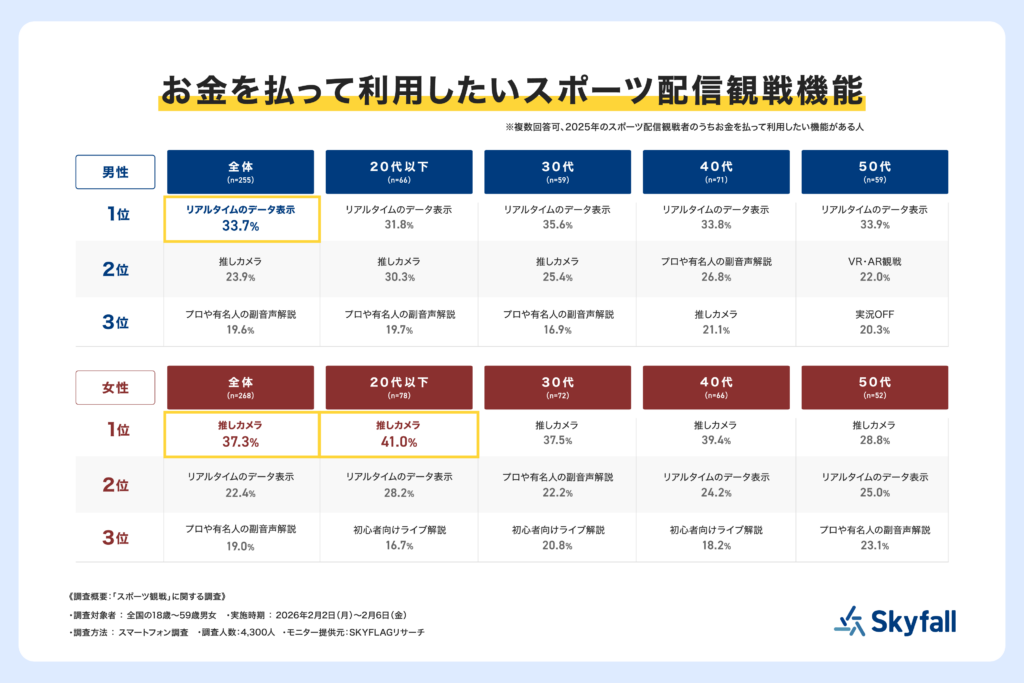 さらに、2025年にスポーツを配信で観戦した800人のうち、お金を払って利用したい機能がある523人を対象に「利用したい機能」について聞いたところ(複数回答可)、性年代別に見ると、「推しカメラ」は全年代で女性の割合が高く、特に20代以下女性(n=78)では41.0%に上ることが分かりました。一方で「リアルタイムのデータ表示」は全年代で男性の割合が高く、試合分析への関心の高さがうかがえる結果となりました。