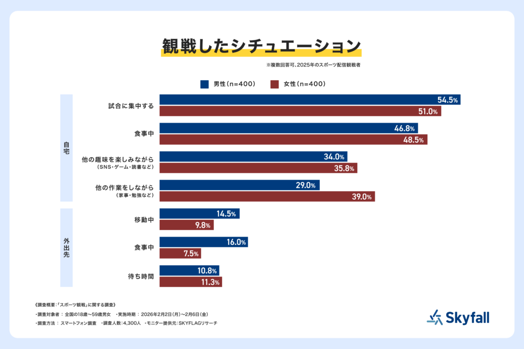 次に、2025年にスポーツを配信で観戦した800人を対象に「観戦したシチュエーション」について聞いたところ(複数回答可)、性別(n=各400)で見ると、「(自宅で)試合に集中する」「移動中」「(外出先の)食事中」において男性が3.0%以上上回り、「(自宅で)他の作業をしながら」において女性が3.0%以上上回ることがわかりました。