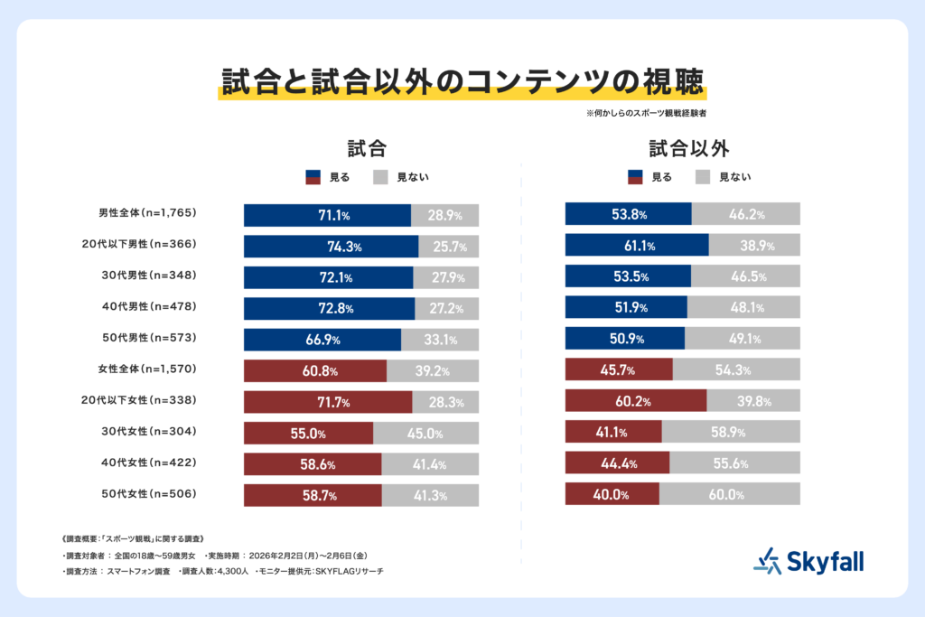 試合がメインのコンテンツと認識されている中で、20代以下は男女問わず試合以外のコンテンツも視聴する熱心な視聴者層であることがうかがえます。女性においては、30代以上で視聴割合が低下しており、ライフステージの変化が影響している可能性も示唆される結果となりました。