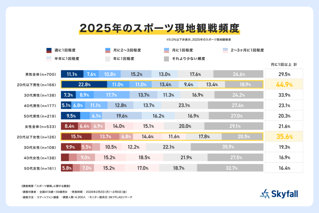 株式会社Skyfall(本社:東京都港区、代表取締役社長:長谷川 智一、以下Skyfall)が運営するマーケティングリサーチ事業の一環として、全国の18歳から59歳の男女4,300人を対象に、「スポーツ観戦」に関する調査(調査期間:2026年2月2日(月)~2月6日(金))を『SKYFLAGリサーチ』を用いて実施しました。