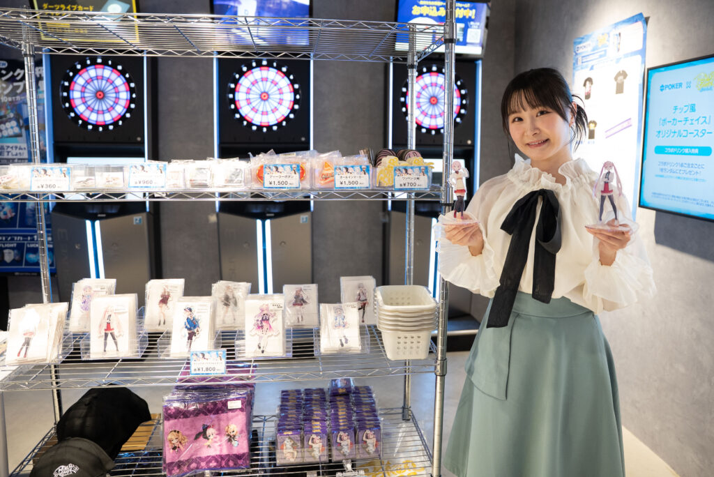 コラボ期間中よりご好評をいただいていた『ポーカーチェイス』限定グッズを取り揃えたオリジナルショップでは、Tシャツやキャップなどのアパレルから、アクリルスタンド、トランプといった定番アイテムまで幅広くラインナップし、今回初登場となるディーラーボタンやワッペンなどの新商品も販売いたしました。