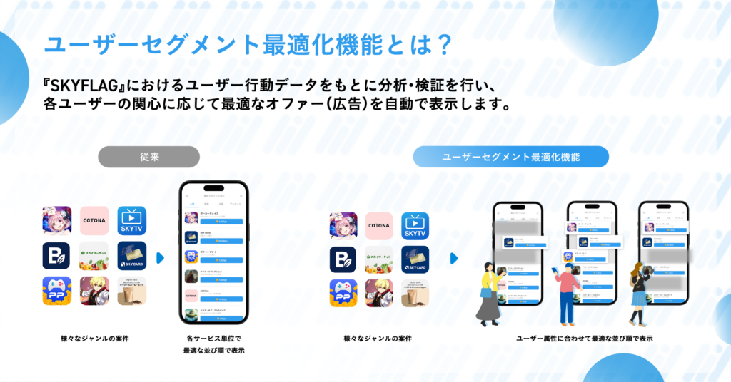 ユーザーセグメント最適化機能では、『SKYFLAG』におけるユーザー行動データをもとに、各ユーザーの関心に応じて最適なオファー(広告)を自動で表示します。これにより、オファー(広告)への挑戦頻度が高まり、サービス内通貨(コイン・ポイント)の獲得機会を創出し、体験価値の向上とユーザー行動の活性化、さらにはメディア収益の最大化に寄与しています。