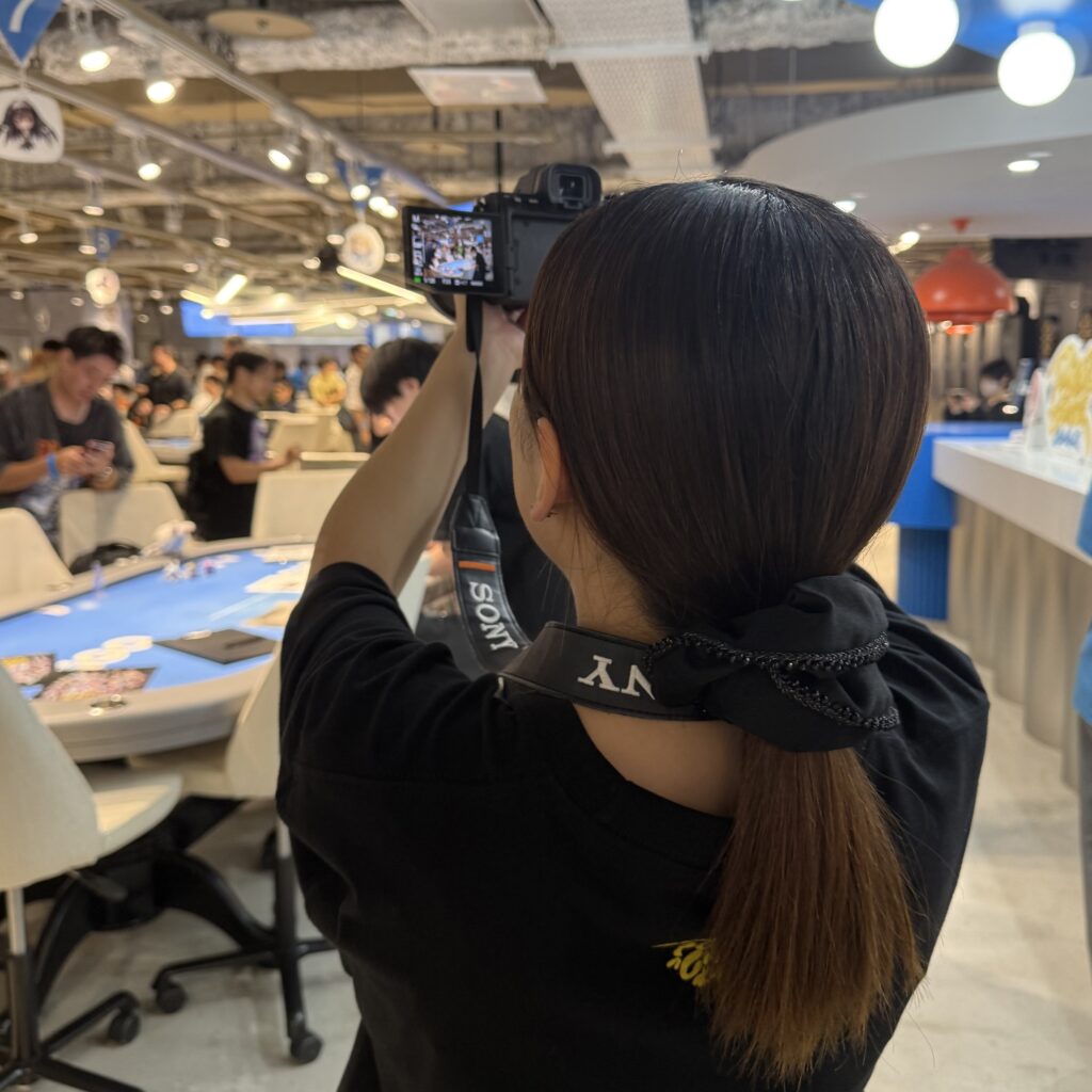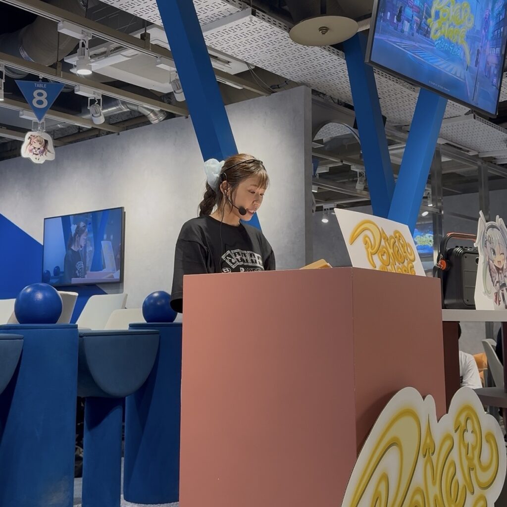 今回のオフラインイベントは、『ポーカーチェイス』の開発・運営を管轄するアプリ本部と、イベント関連の制作や進行を担当するブランディング本部の社員が運営に携わり、当日はイベントMCやポーカーの実況、撮影などを行いました。さらにイベント中は、普段はなかなかオフラインでお会いできない『ポーカーチェイス』ユーザーの皆さまと交流することができました。