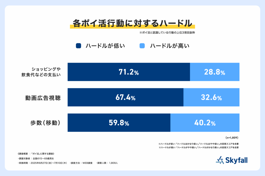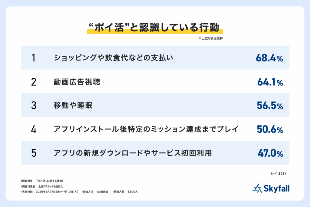 株式会社Skyfall(本社:東京都港区、代表取締役社長:長谷川 智一、以下Skyfall)は、当社の運営するマーケティングリサーチ事業の一環として、全国の15歳から69歳の男女1,809人と、そのうち、共通ポイントを貯めることがポイ活だと認識し1ヶ月以内に実施した946人を対象に、「ポイ活」に関する調査(調査期間:2025年6月27日(金)~7月10日(木))を実施しました。