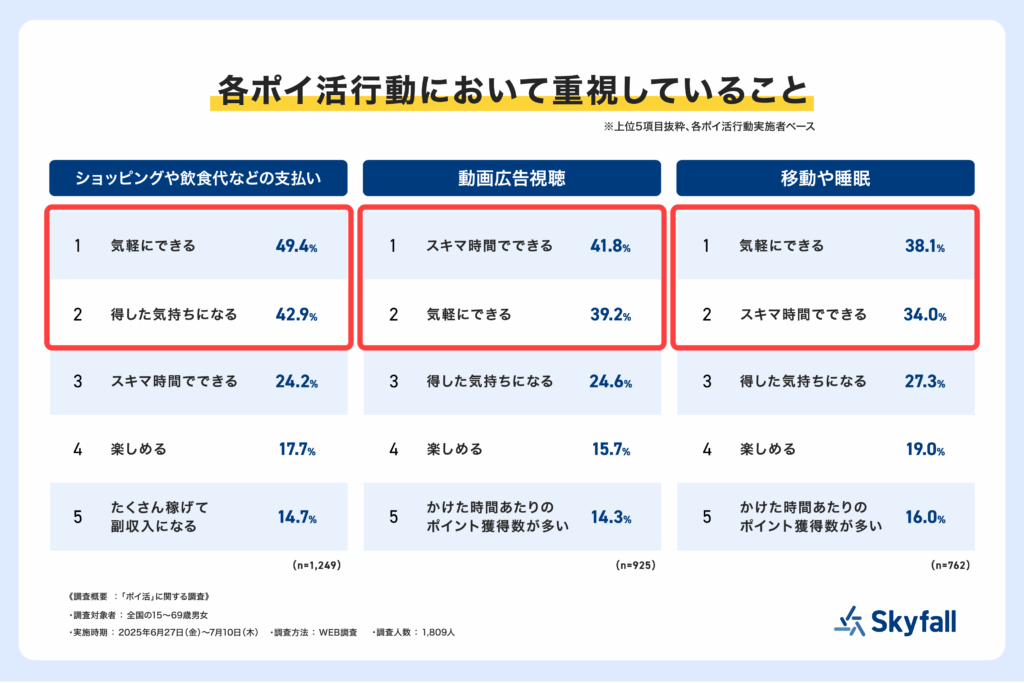 ポイ活で求められるのは「気軽さ」と「即時性」でスキマ時間の活用が重視されていることが明らかに。ポイ活で人気な行動は「ショッピング」「動画視聴」「移動や睡眠」が上位