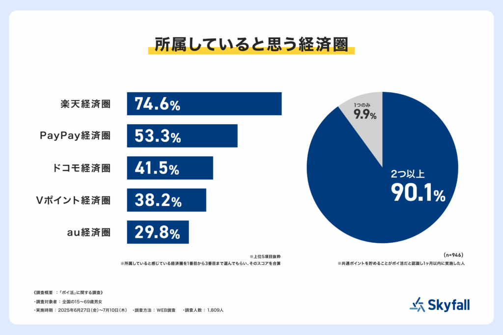 所属している経済圏は楽天とPayPayが2強。dポイント、Vポイント、auも上位に入り、9割が複数の経済圏を併用していることが判明。